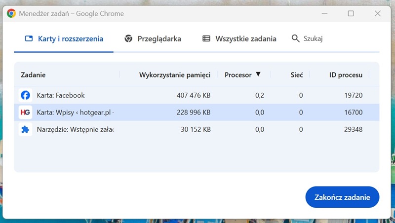 Menedżer zadań Google Chrome. Grafika HotGear.