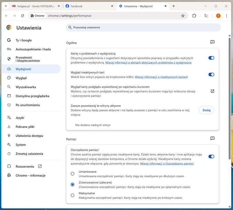 Ustawienia wydajności w przeglądarce Google Chrome. Grafika HotGear.