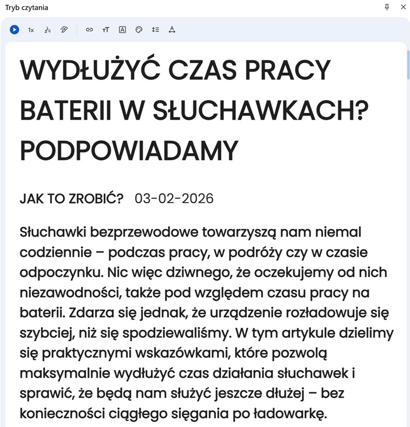 Portale informacyjne bywają przeładowane rozpraszaczami – od migających reklam, przez zbędne paski boczne, aż po wyskakujące okienka. Chrome posiada wbudowany tryb czytania, który pozwala nam skupić się wyłącznie na treści artykułu. Funkcję tę wywołujemy poprzez panel boczny przeglądarki. Po jej aktywacji tekst zostaje wyświetlony w czystej, minimalistycznej formie. Mamy tu pełną kontrolę nad wyglądem strony: możemy dowolnie zmieniać krój i wielkość czcionki, regulować odstępy między wierszami, a nawet modyfikować kolor tła (np. na sepia lub ciemny), co znacznie mniej męczy wzrok podczas długiej lektury, szczególnie w godzinach wieczornych. Można też tu użyć funkcji czytania na głos.