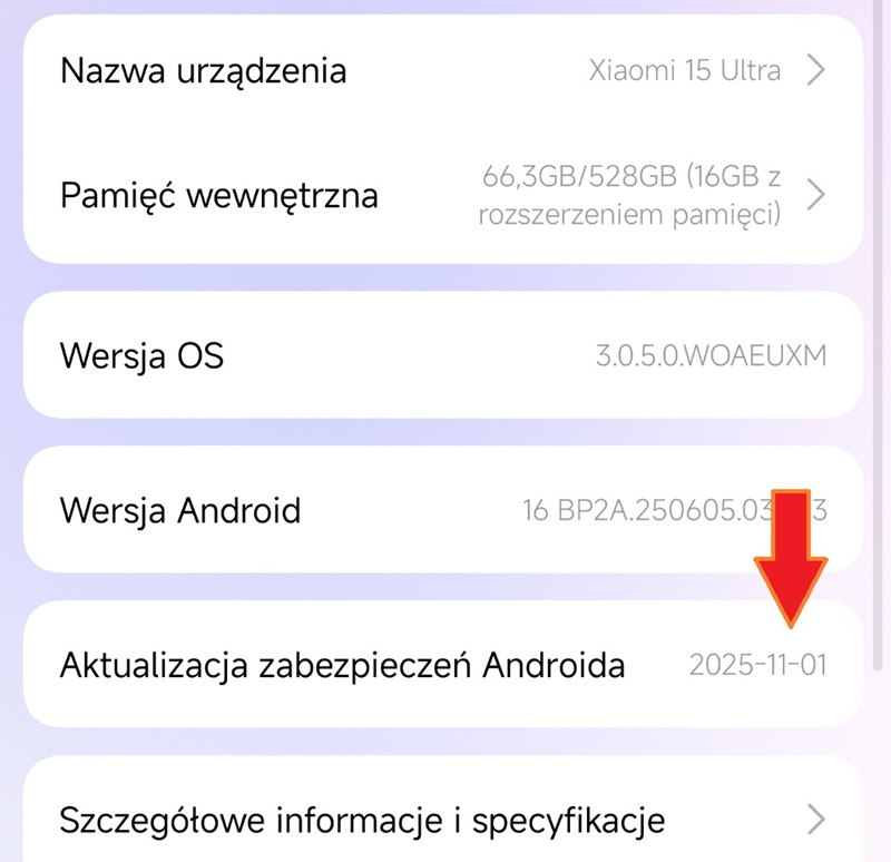 Datę aktualizacji zabezpieczeń można znaleźć w ustawieniach, najczęściej w dziale „O telefonie”. Fot. HotGear.