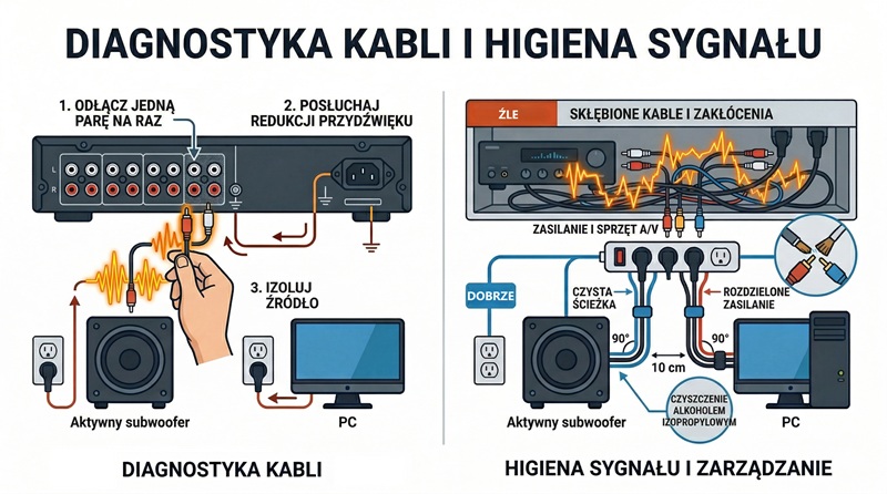 Jeśli system jest już połączony i buczenie jest minimalne, ale wciąż obecne, wykonujemy prosty test ruchowy. Przy włączonej muzyce (lub w pauzie, gdy przydźwięk jest najlepiej słyszalny) zaczynamy fizycznie przesuwać kable sygnałowe za szafką RTV.
