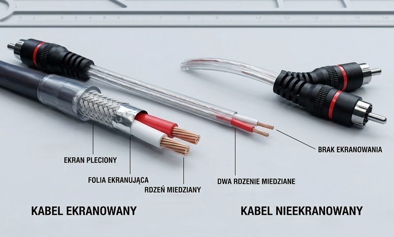 Większość tanich przewodów RCA, dodawanych fabrycznie do odtwarzaczy czy tunerów, posiada bardzo cienki ekran lub nie ma go wcale. Wewnątrz takiego kabla żyła gorąca, prowadząca sygnał audio, biegnie niemal bez żadnej ochrony przed polem magnetycznym. Warto zainwestować w przewody z pełnym oplotem miedzianym lub folią aluminiową, które fizycznie blokują dostęp zakłóceń do wnętrza kabla. Dobry kabel sygnałowy nie musi kosztować fortuny, ale powinien być zauważalnie grubszy i sztywniejszy od najtańszych zamienników.