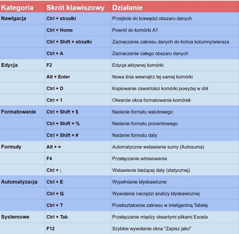 Tabela kluczowych skrótów i kombinacji w programie Excel. Grafika HotGear.