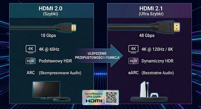 Zaglądając do tylnego panelu telewizora, zwykle dostrzeżemy tam od trzech do czterech gniazd HDMI, które na pierwszy rzut oka wyglądają identycznie. To jednak bardzo mylące wrażenie, ponieważ producenci sprzętu rzadko wyposażają wszystkie wejścia w najnowocześniejsze układy o pełnej przepustowości. W większości odbiorników ze średniej i niższej półki cenowej tylko jedno lub dwa gniazda obsługują standard HDMI 2.1, podczas gdy pozostałe bazują na starszej wersji 2.0. Różnica w przepustowości jest tutaj kluczowa – starszy standard oferuje 18 Gbps, co wystarcza do wyświetlania obrazu 4K w 60 klatkach na sekundę, natomiast nowy standard to aż 48 Gbps. Ta dodatkowa wydajność jest niezbędna, jeśli chcemy korzystać z gier w 4K przy 120 Hz lub włączyć dynamiczne odświeżanie obrazu bez efektu rwania klatek.