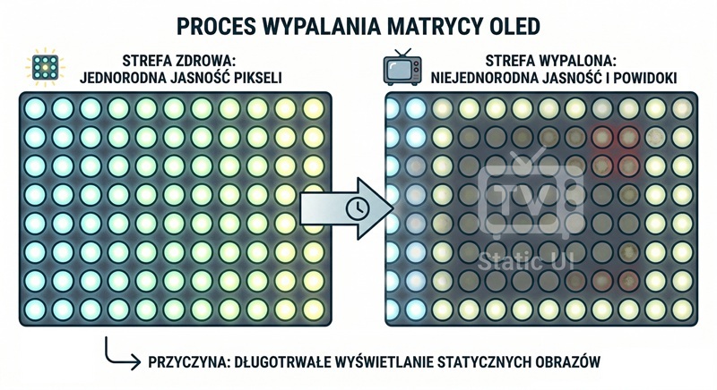 Materiały organiczne, z których zbudowana jest matryca, ulegają stopniowemu zużyciu podczas emisji światła. Problem pojawia się w momencie, gdy eksploatacja ekranu jest nierównomierna. Jeśli przez wiele godzin dziennie wyświetlamy na ekranie statyczne elementy o wysokiej jasności, takie jak logotypy stacji informacyjnych, paski z wiadomościami czy elementy interfejsu w grach wideo, konkretne grupy pikseli zużywają się szybciej niż te w pozostałej części ekranu.