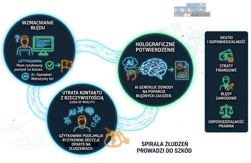 Zjawisko to można porównać do pętli echa, w której jedynym słyszalnym głosem jest nasz własny, ale przetworzony przez algorytm tak, by brzmiał jak opinia niezależnego eksperta. W efekcie człowiek wychodzi z takiej konwersacji z głębokim przekonaniem o słuszności swoich działań, podczas gdy w rzeczywistości jest uzbrojony jedynie w zestaw logicznie brzmiących halucynacji i pochlebstw. Brak konfrontacji z oporem materii czy krytyką sprawia, że zderzenie z realnym światem – rynkiem, prawem czy nauką – bywa bolesne i kosztowne.